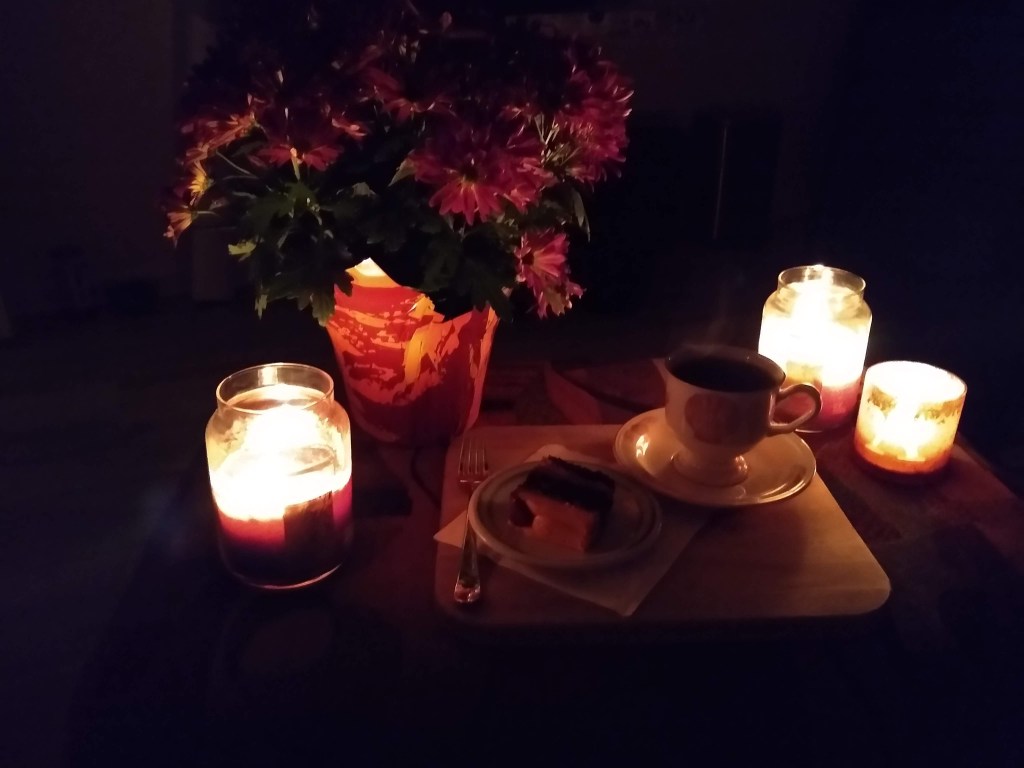 Light a candle near the spot where you will savor your tea and treat. That way, by the time you are ready, the room will be filled with the golden glow of flame and fragrance if it’s scented.